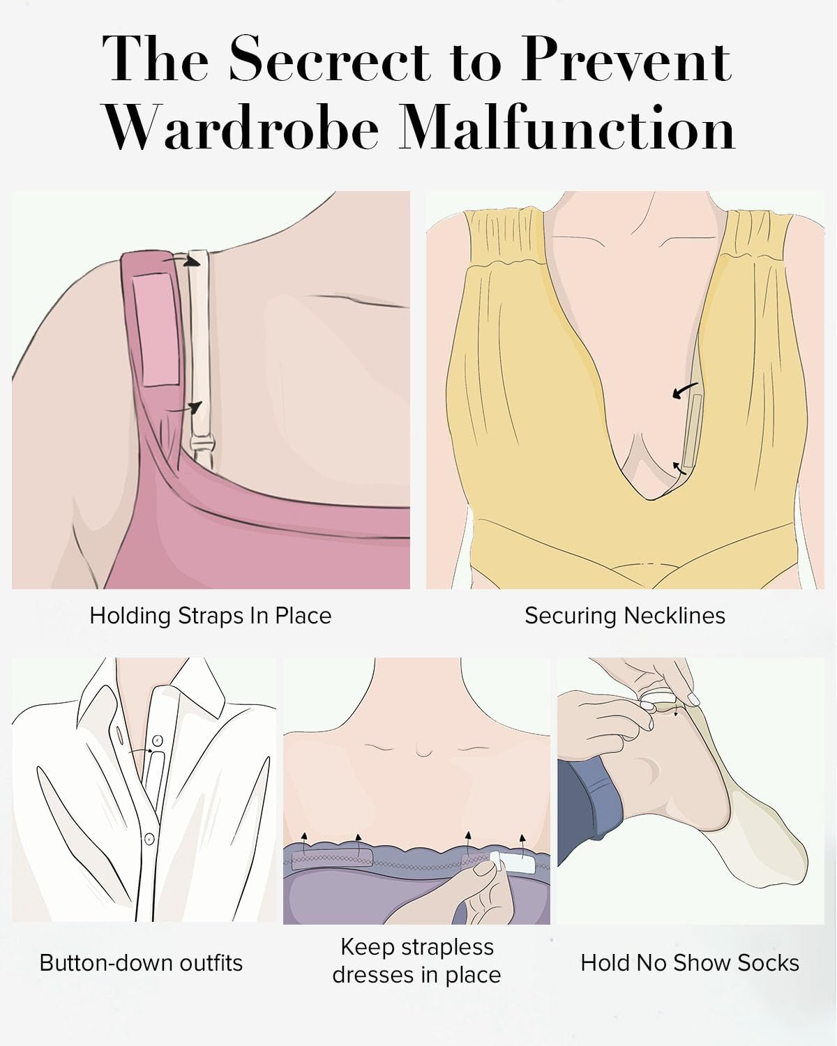 Suitable for Any Clothing: For low necklines and dresses that tend to float, gaps between shirt buttons, hidden underwear straps, fixed sock cuffs and high heels, secret tape is undoubtedly the best solution.